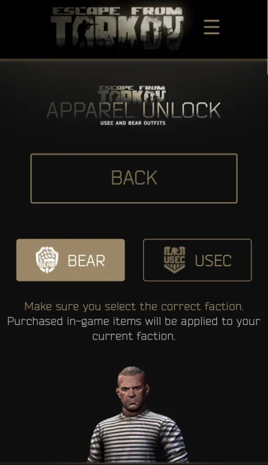 Je možnost zakoupit vybranou sadu oblečení pro jednu z frakcí USEC nebo BEAR. Aktivace proběhne ihned po zakoupení a nákup zůstává zachován i po wipe.